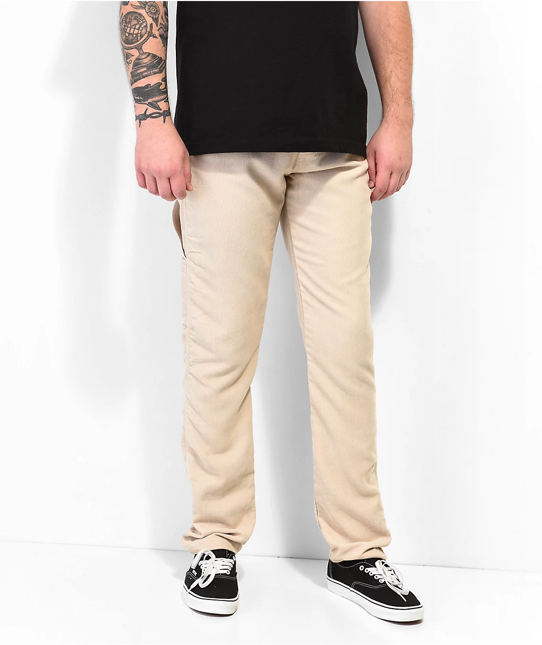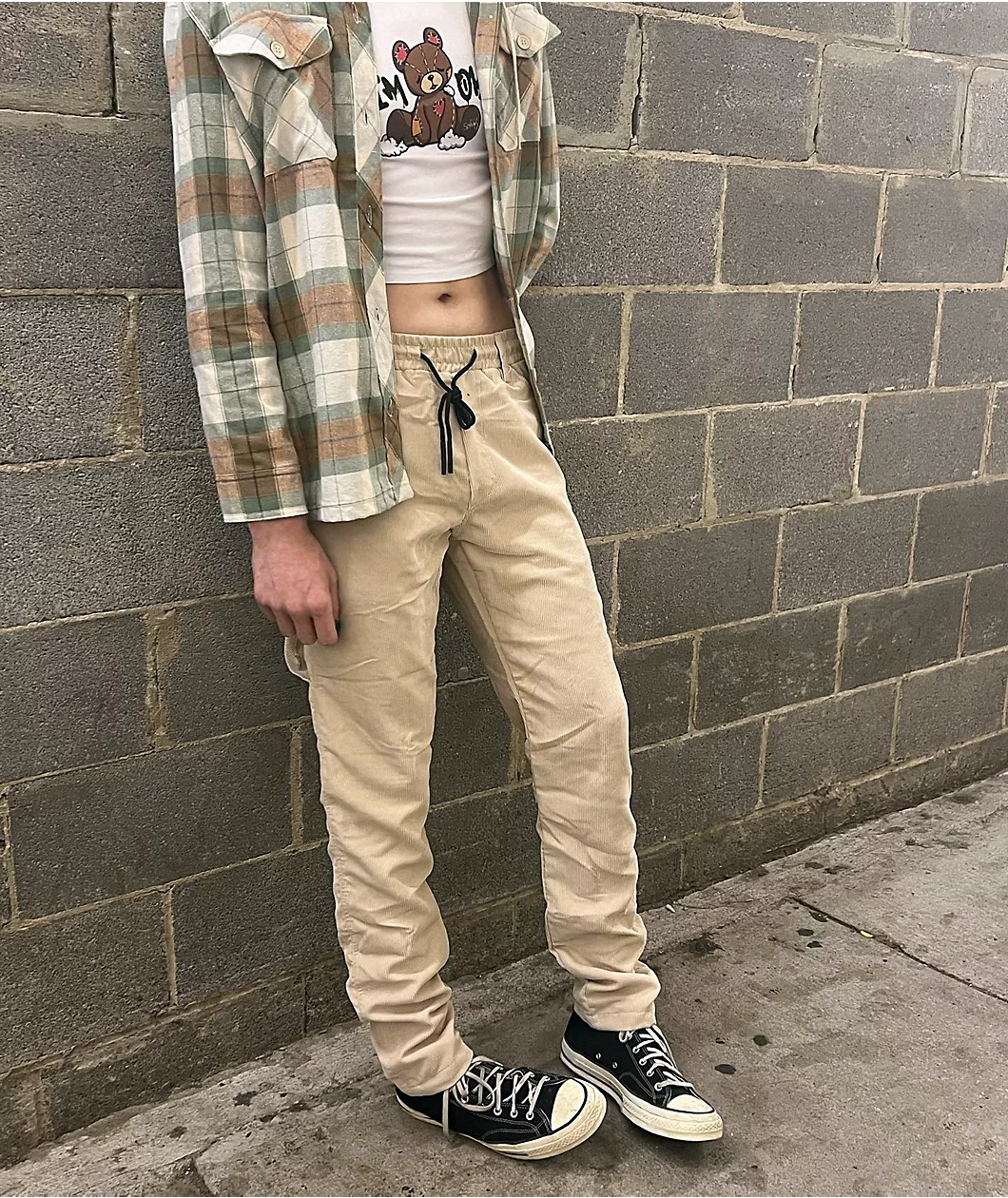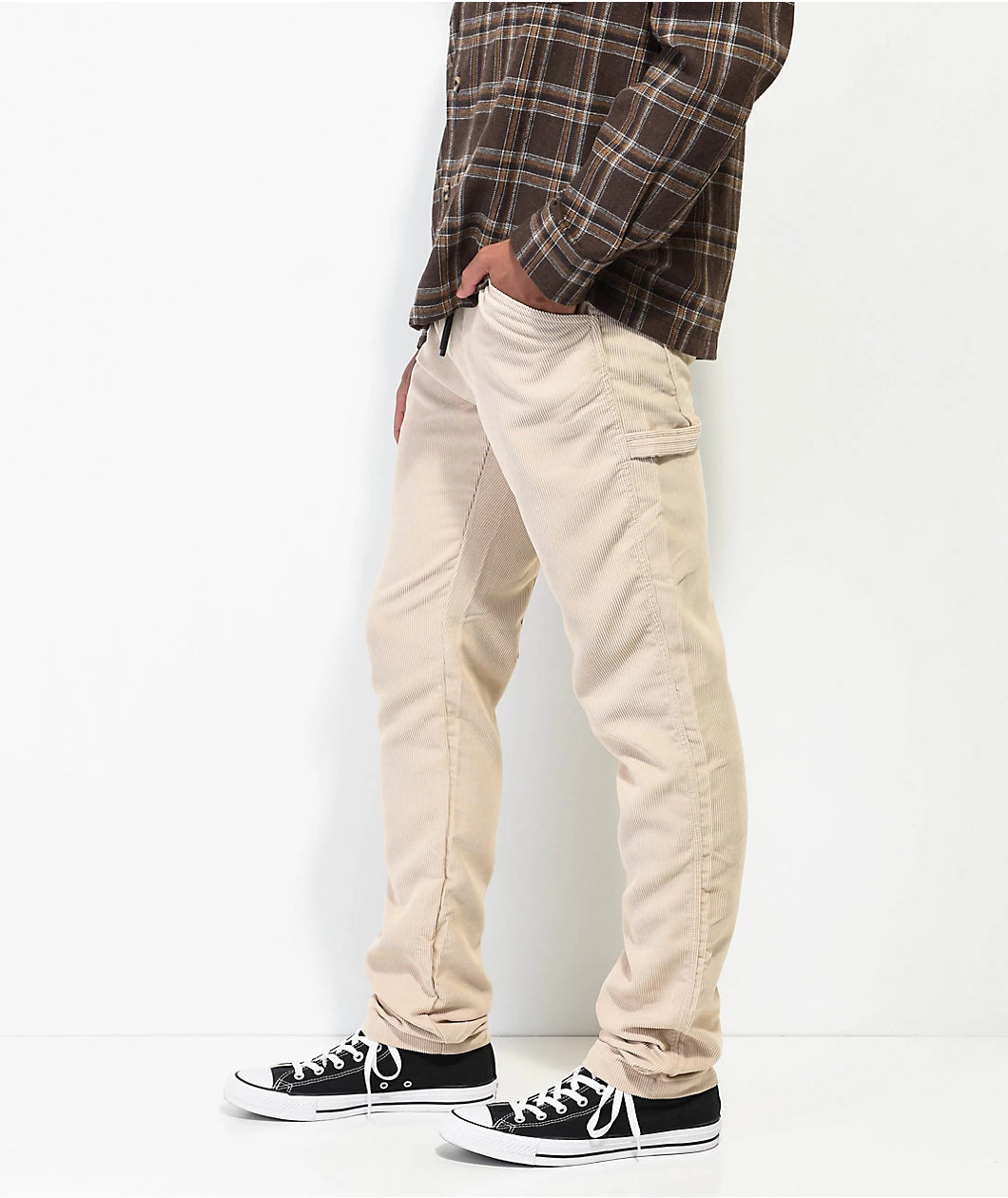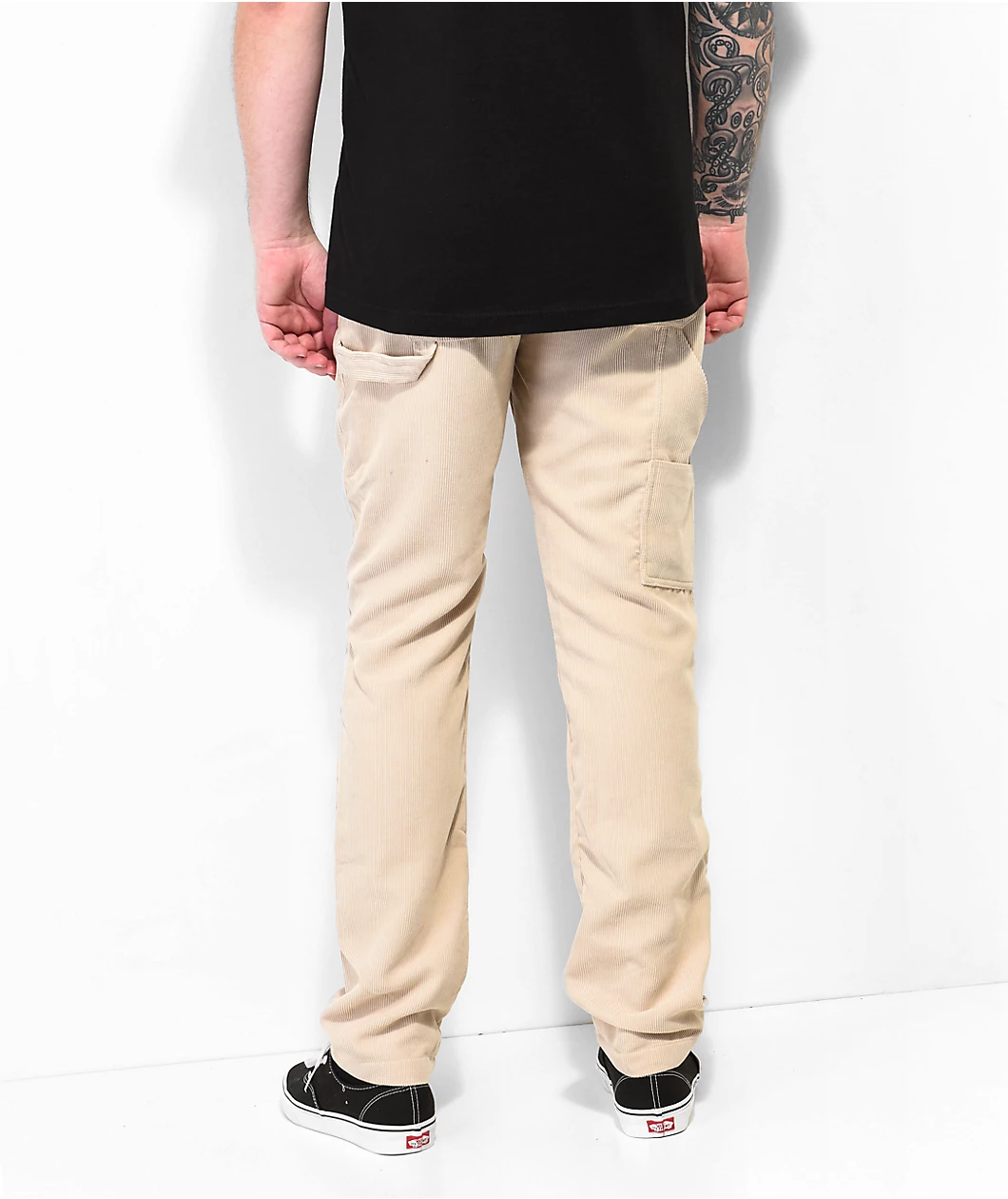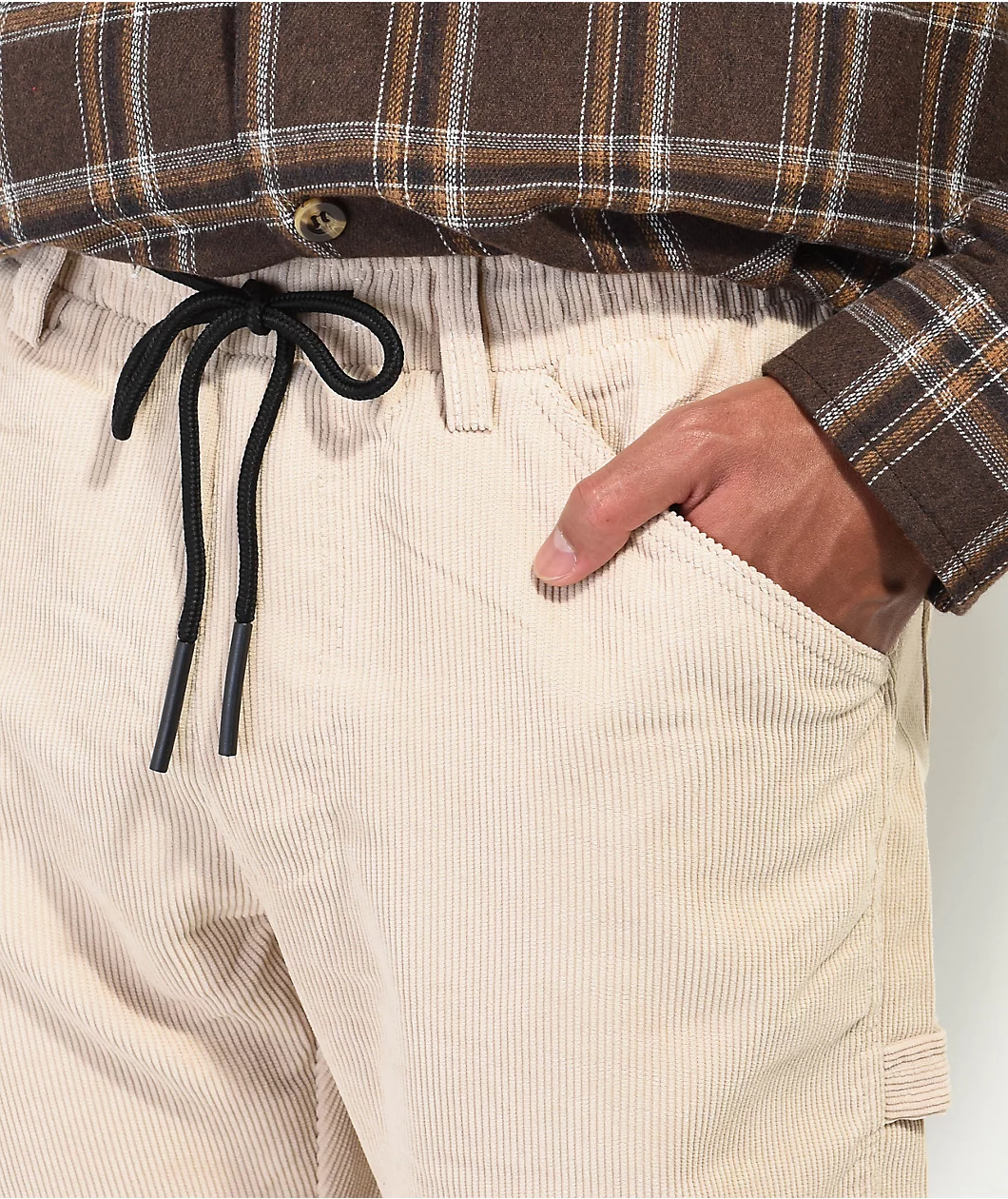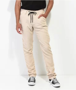 These American Stitch carpenter pants come in a khaki corduroy construction with a drawstring-adjustable elastic waistband for the perfect fit. These 100% polyester pants feature a high rise waist with a slightly tapered leg and a four pocket configuration with hammer loops on both thighs.