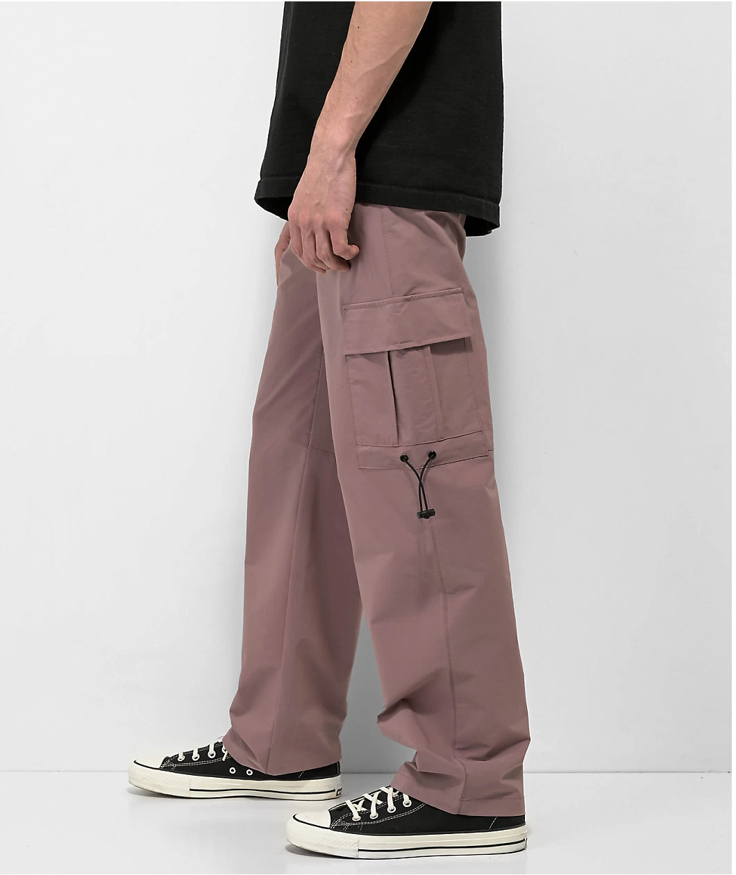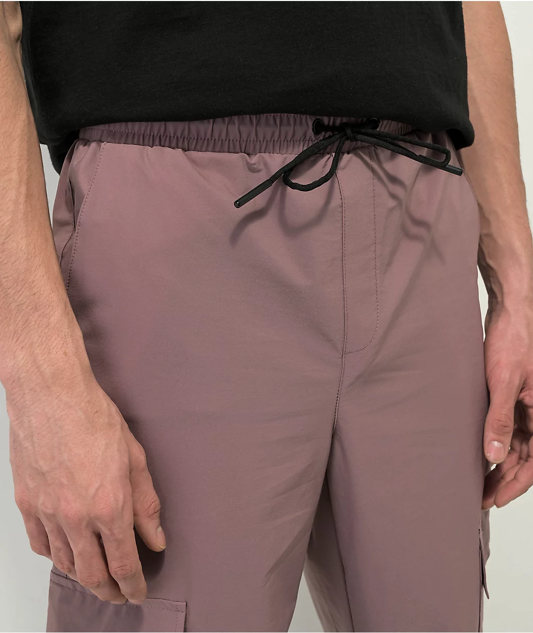 From American Stitch comes the mauve cargo pants with black accents throughout as well as a stylish, drawstring-adjustable waistband for the perfect fit.