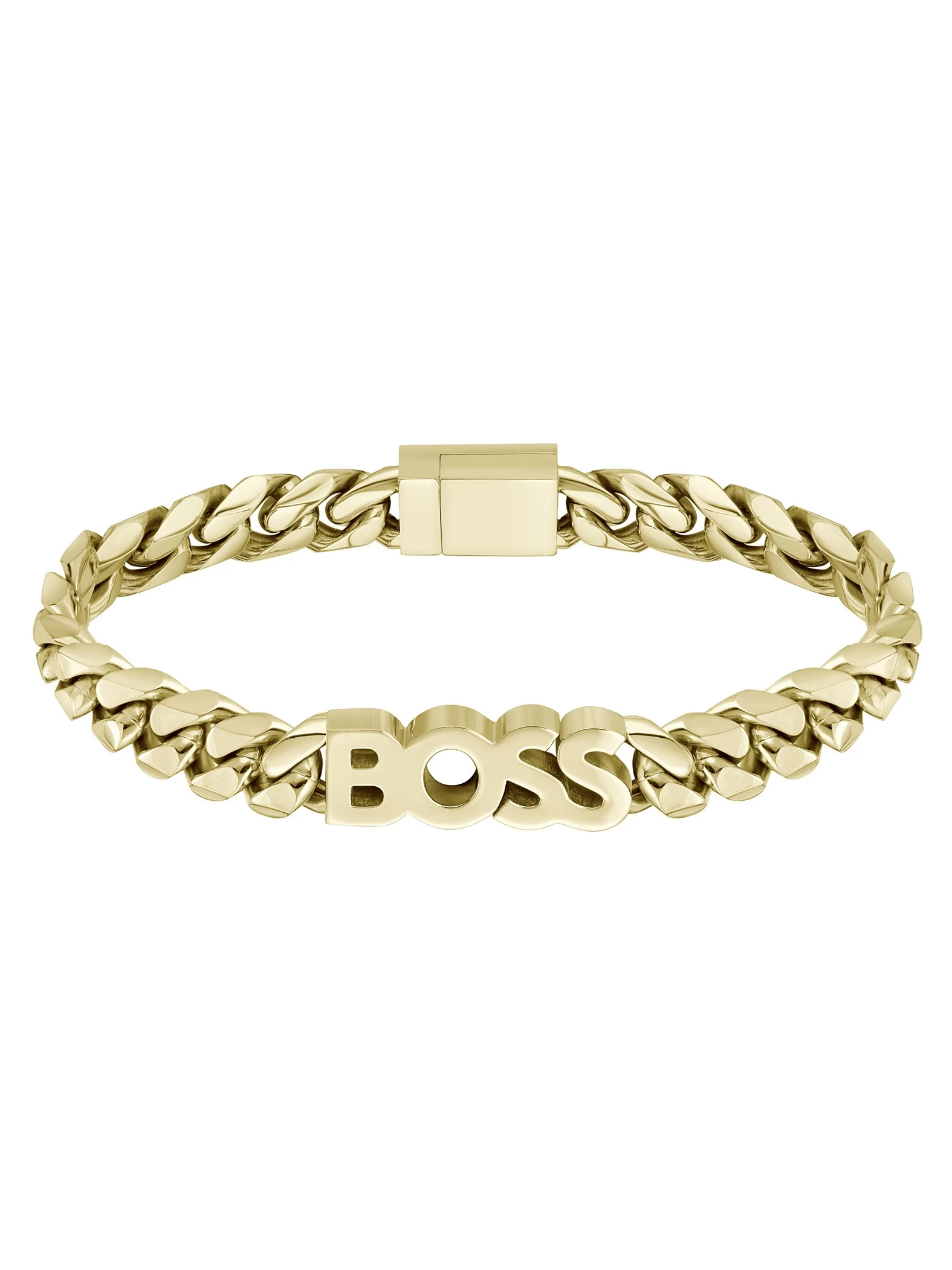 The Kassy Chain Bracelet from BOSS comes in Gold colour, featuring a branded connector and chain. Coming with a magnet connection, this bracelet features a bold BOSS logo on a heavy curb chain. An edition of the BOSS gents light yellow gold IP bracelet from the Kassy collection. Length: 190mm. Width: 10mm.