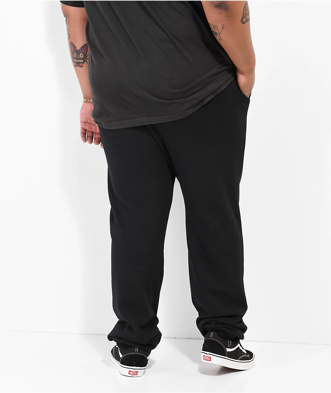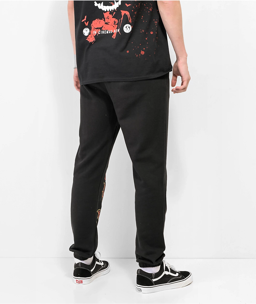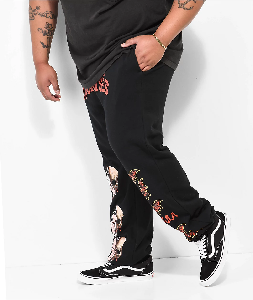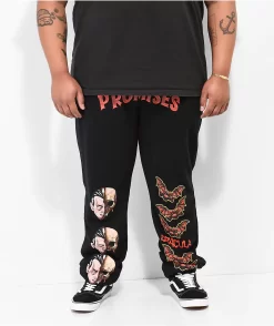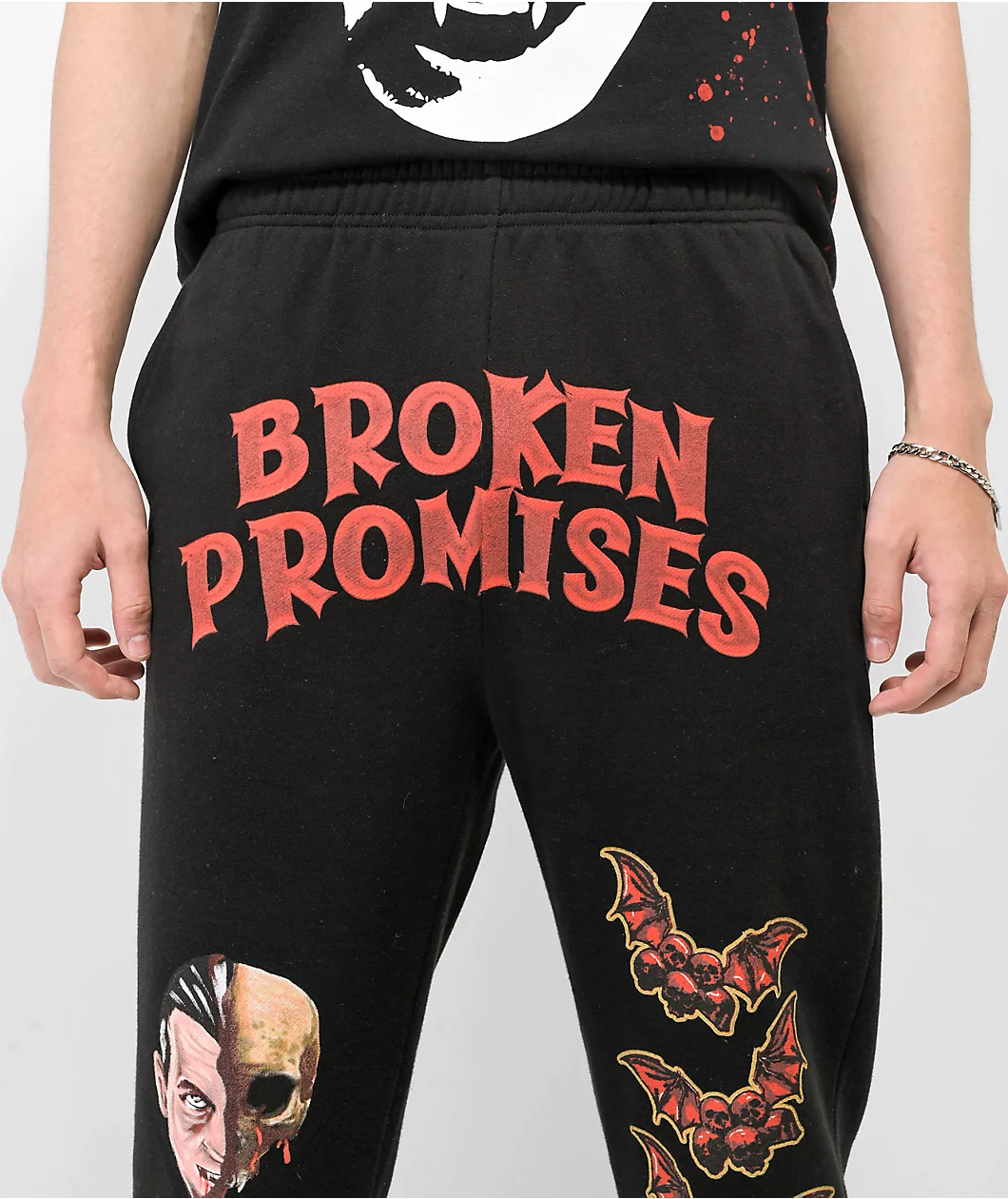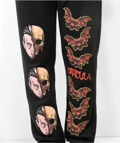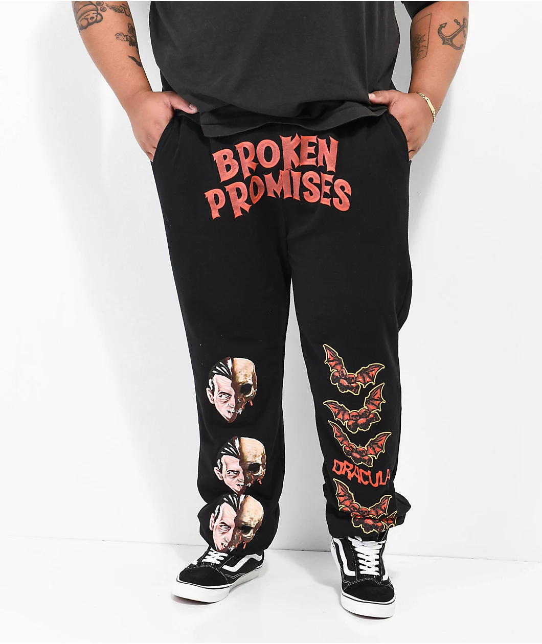 Broken Promises brings the Dracula The Count sweatpants in an ominous black colorway, displaying brand script across the pelvis; with images of bats and skulls down the left thigh and Dracula’s face down the right thigh. These unique sweats feature an ela