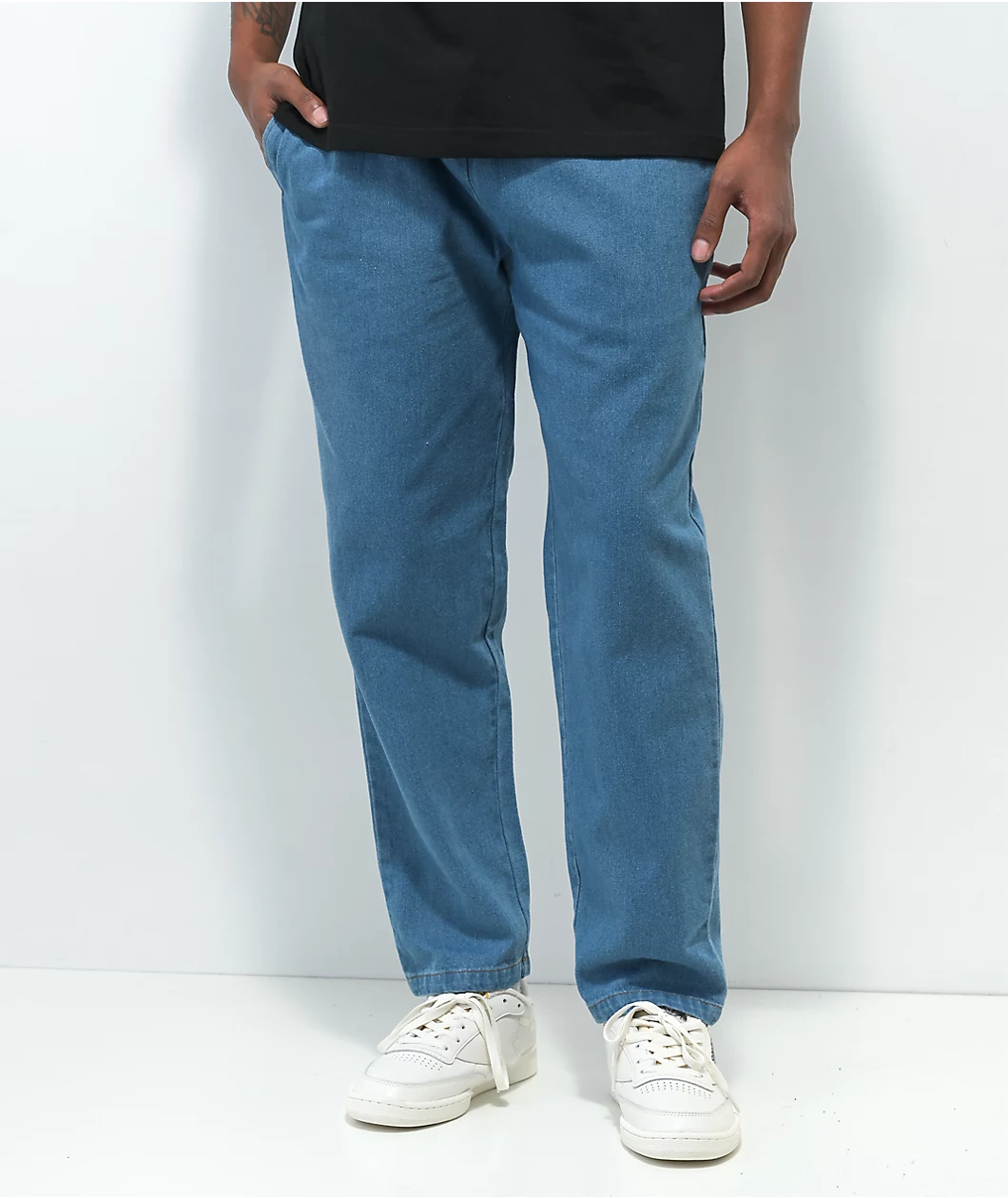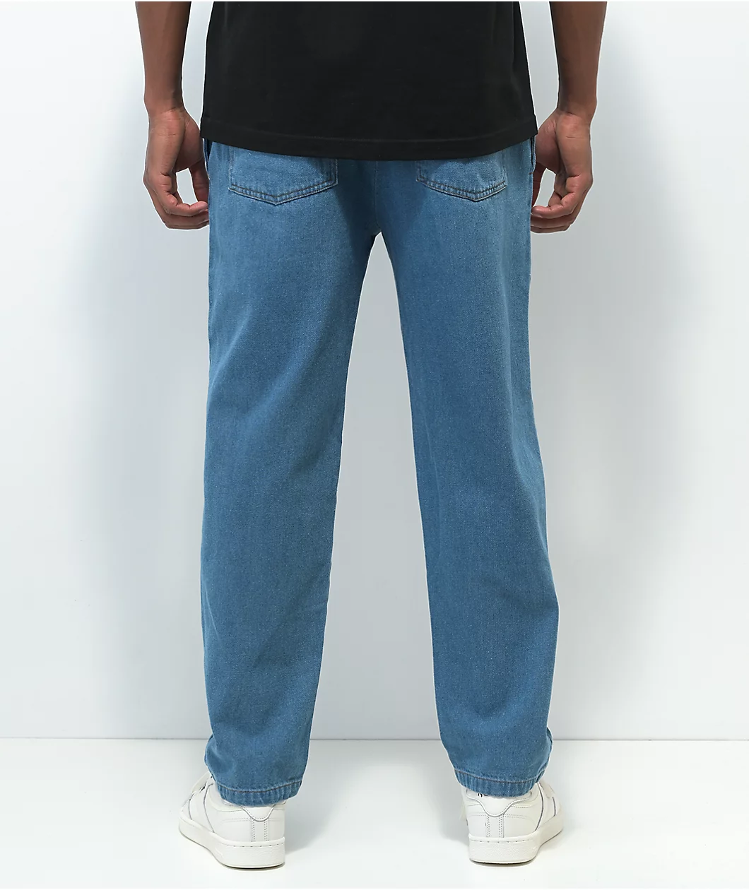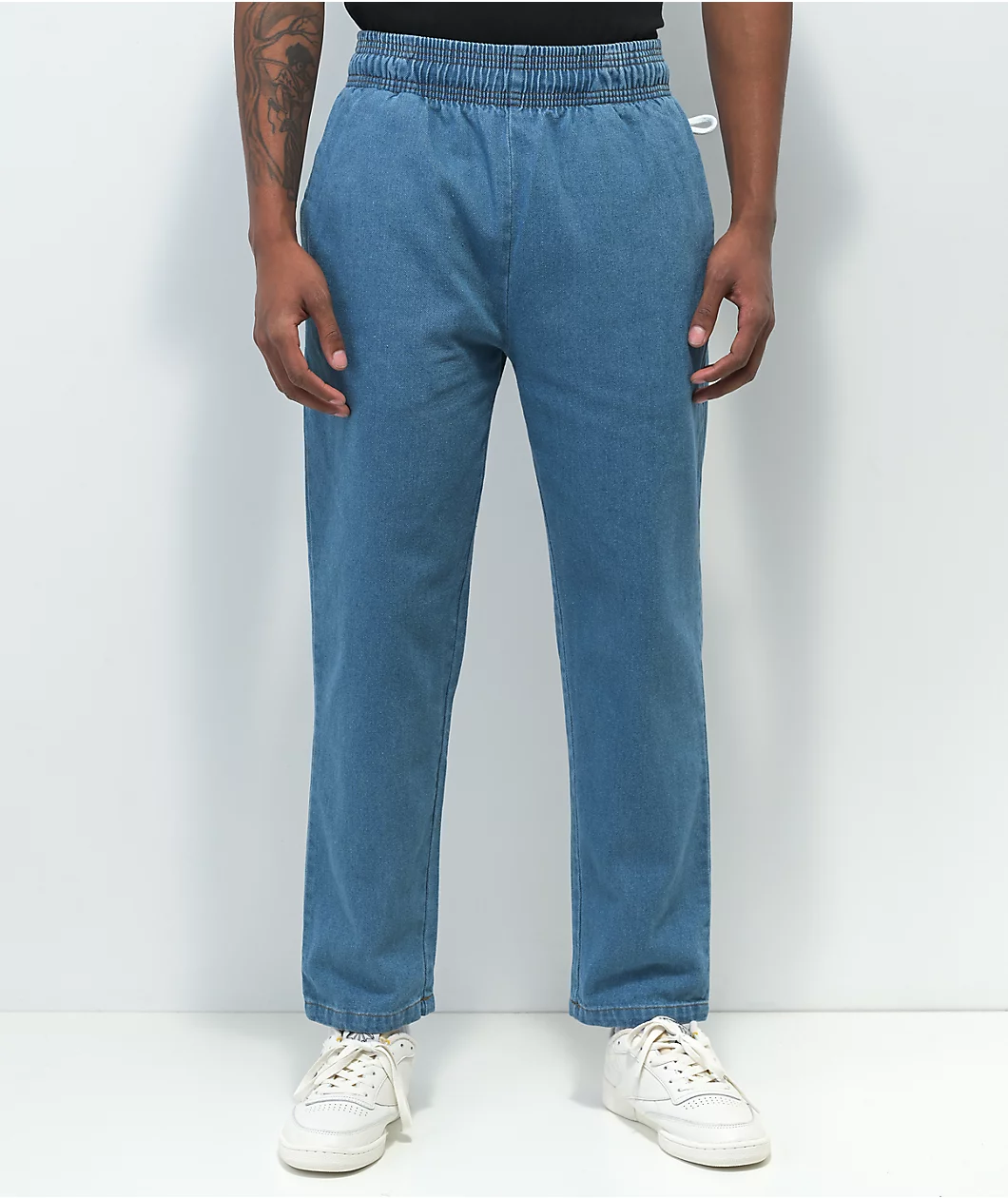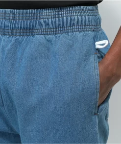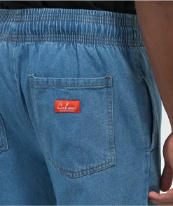 Combining the influential stylings of the 90s with the comfortable silhouette of chef pants, Cookman presents these light blue denim pants. These pants have slash hand pockets and seat pockets, along with a drawstring-adjustable elastic waist, and a fit that is roomier in the thigh and tapered at the ankle.