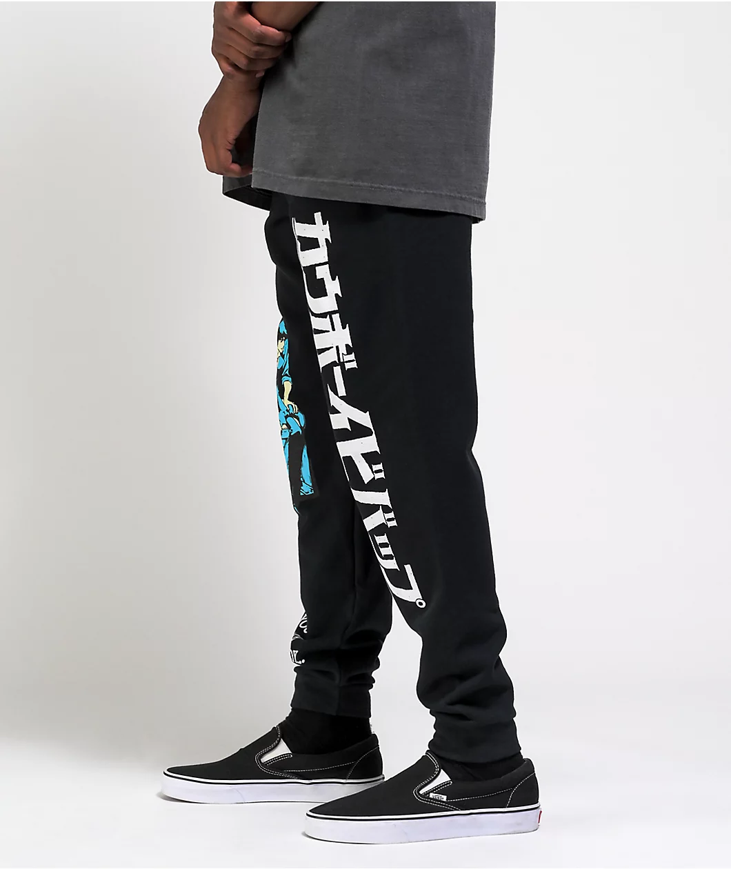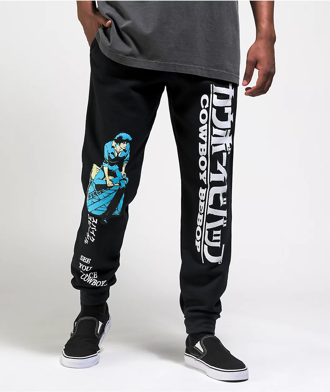 Slap some cartoony vibes into your everyday ensembles with the Cowboy Bebop black sweatpants! A moody illustration of Spike appears at the right leg, with “See you space cowboy” text appearing underneath to create a striking aesthetic. Large Cowboy Bebop script appears down the left leg in both English and Kanji to complete the look of these comfy joggers.