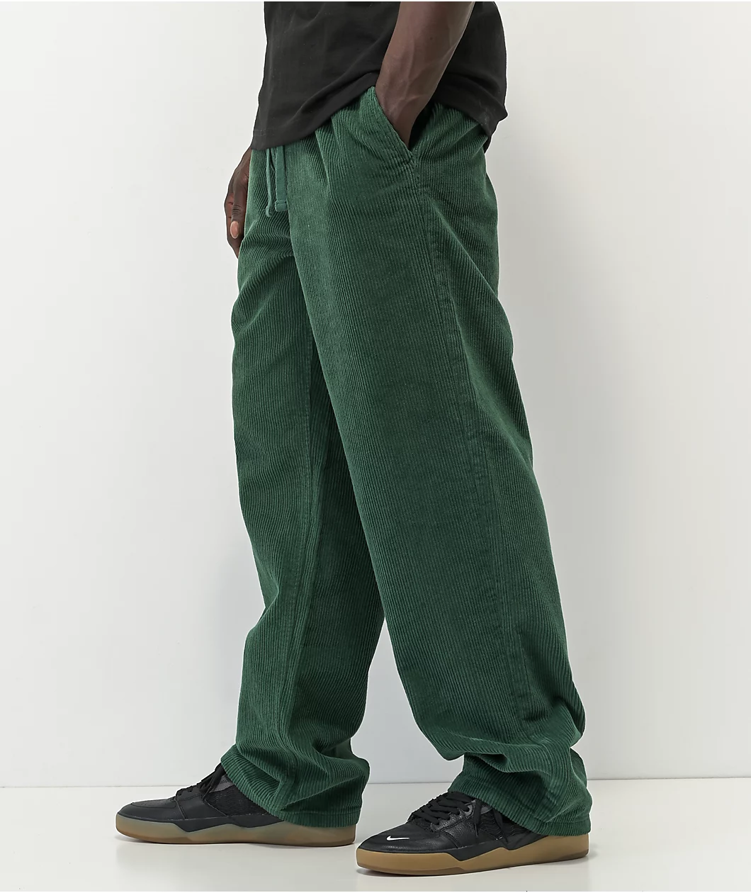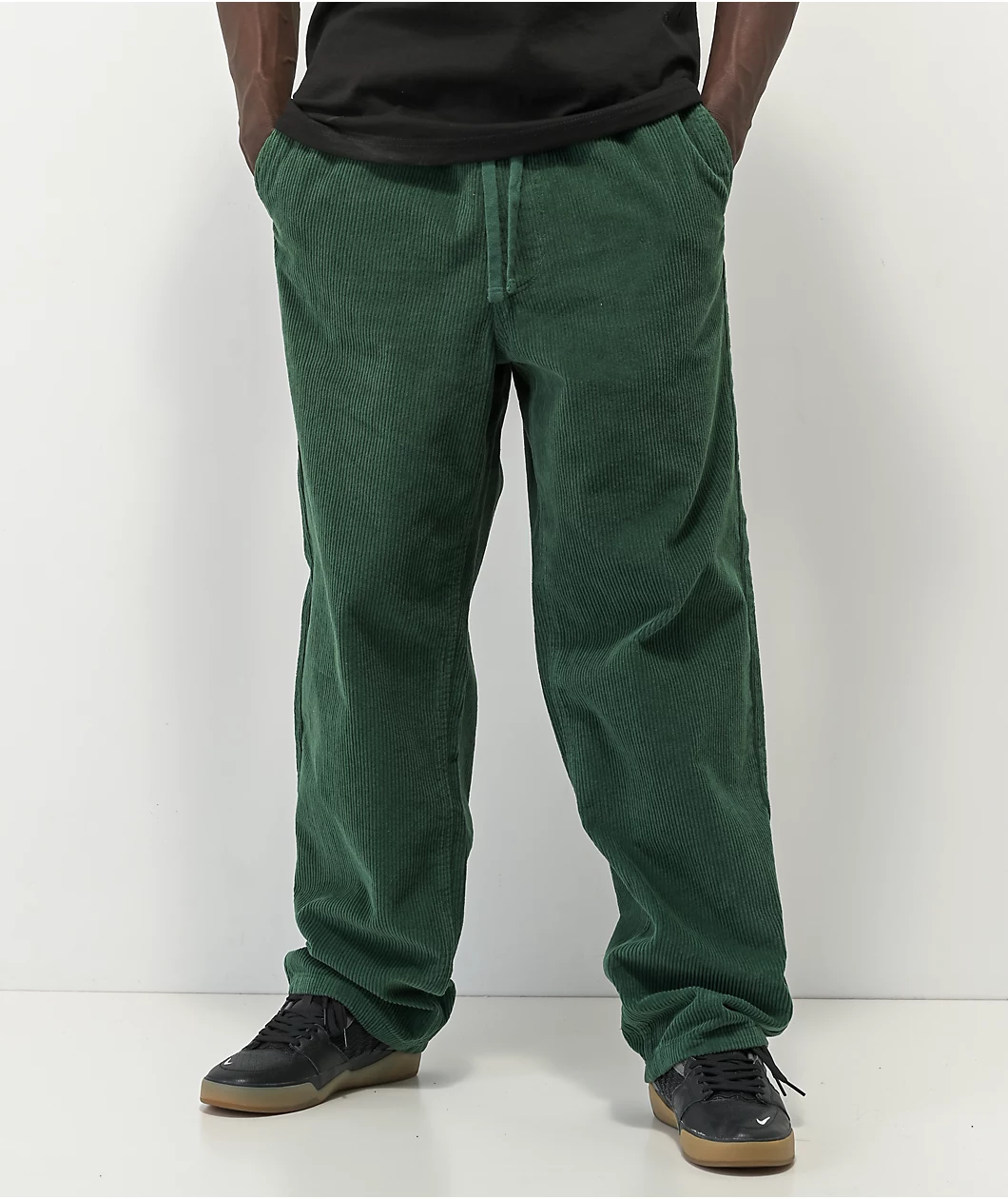 These retro-inspired Johnny Loose Fit skate pants from Empyre have a flashy dark green colorway and thick corduroy construction. In lieu of belt loops, these baggy pants have a drawstring adjustable waist for simple modification and comfortability.