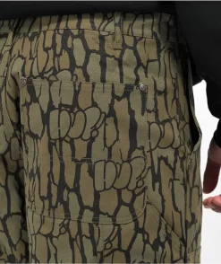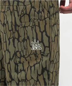 The Gilman double knee carpenter pants feature an all-over bark camo print with bubble lettering subtly incorporated throughout. Made from durable 10oz duck canvas, the green carpenter pants have a 7 pocket configuration with a hammer loop on the thigh to maintain its workwear-inspired vibe. With riveted panels, and a zip fly closure, and branded metallic hardware, the Gilman carpenter pants are finished with embroidery on the left utility pocket.