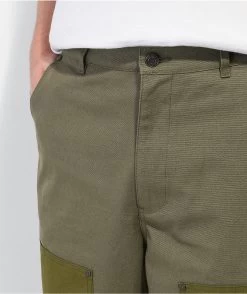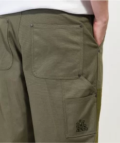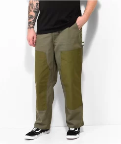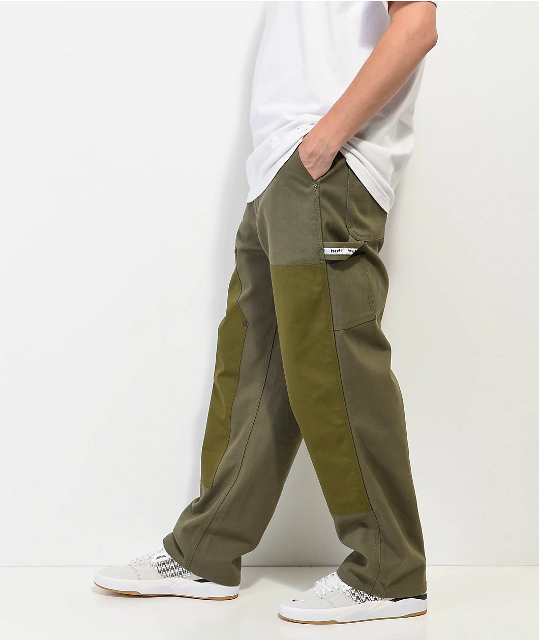 The Gilman HUF utility pants come in a olive colorway with brighter green patches on the legs as well as a regular fit with slightly tapered legs. These pants have button-and-zip closure with two front slash pockets, two back welt pockets, two utility pockets, and hammer hoop detailing on the left leg.