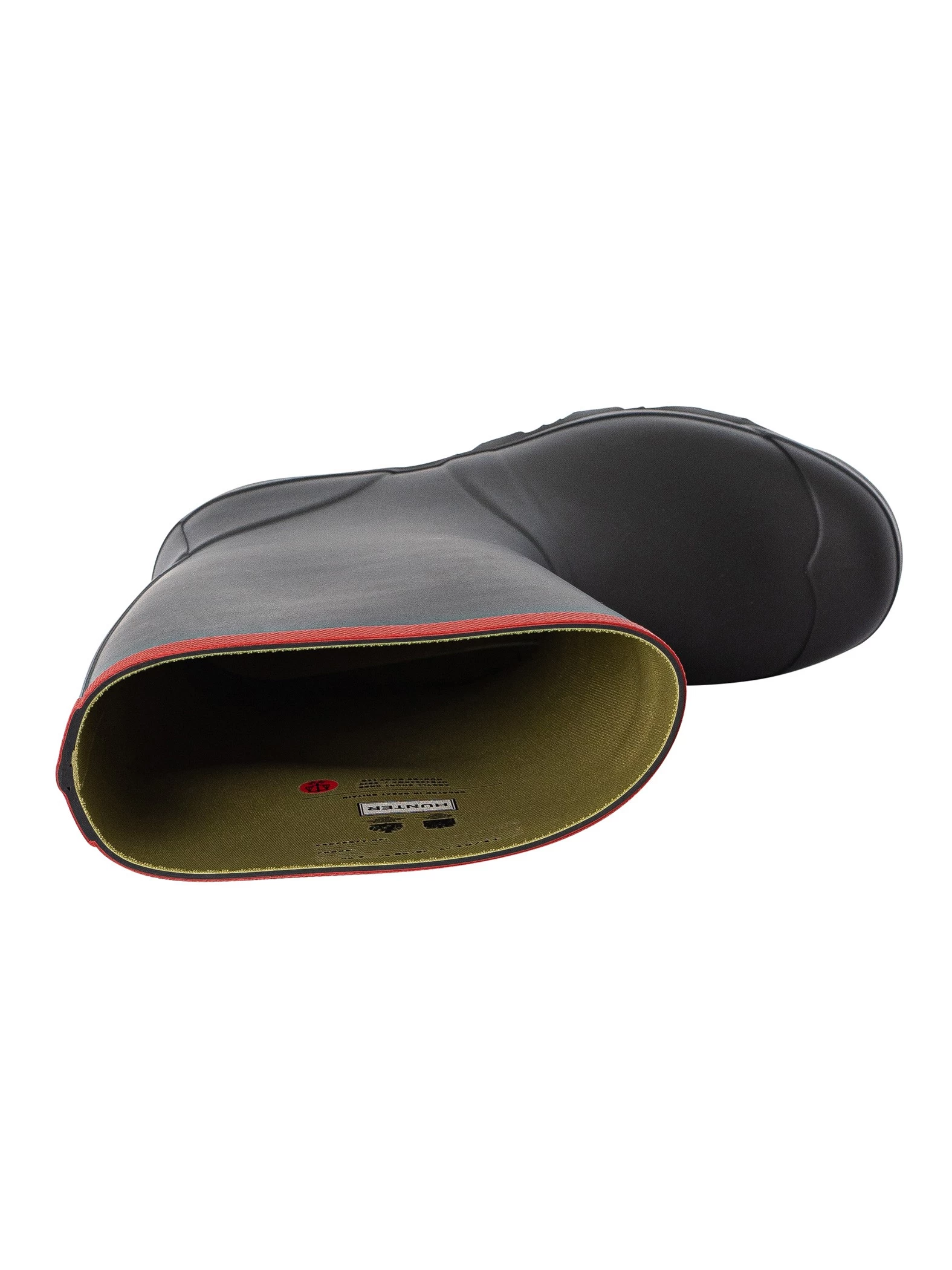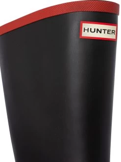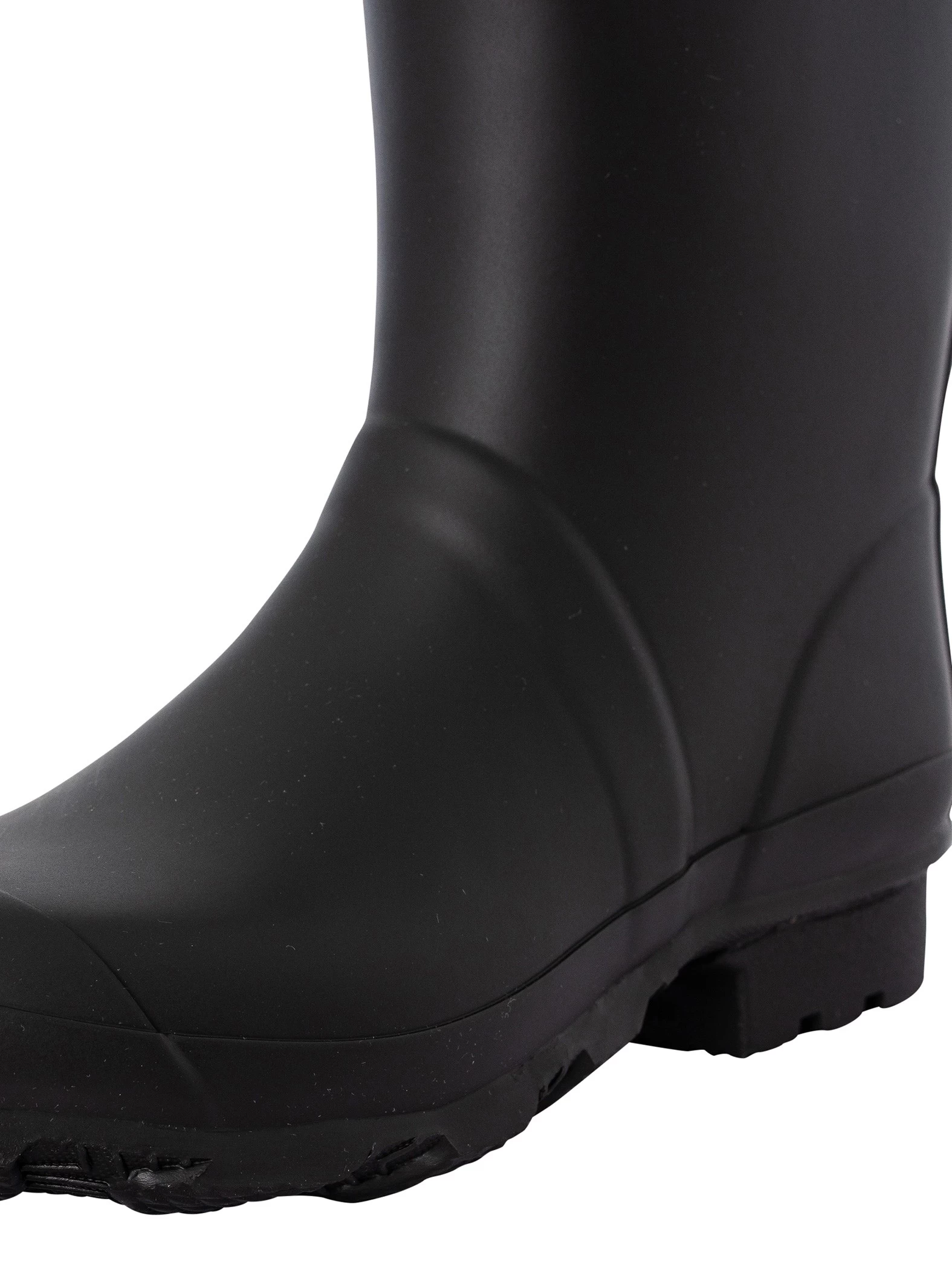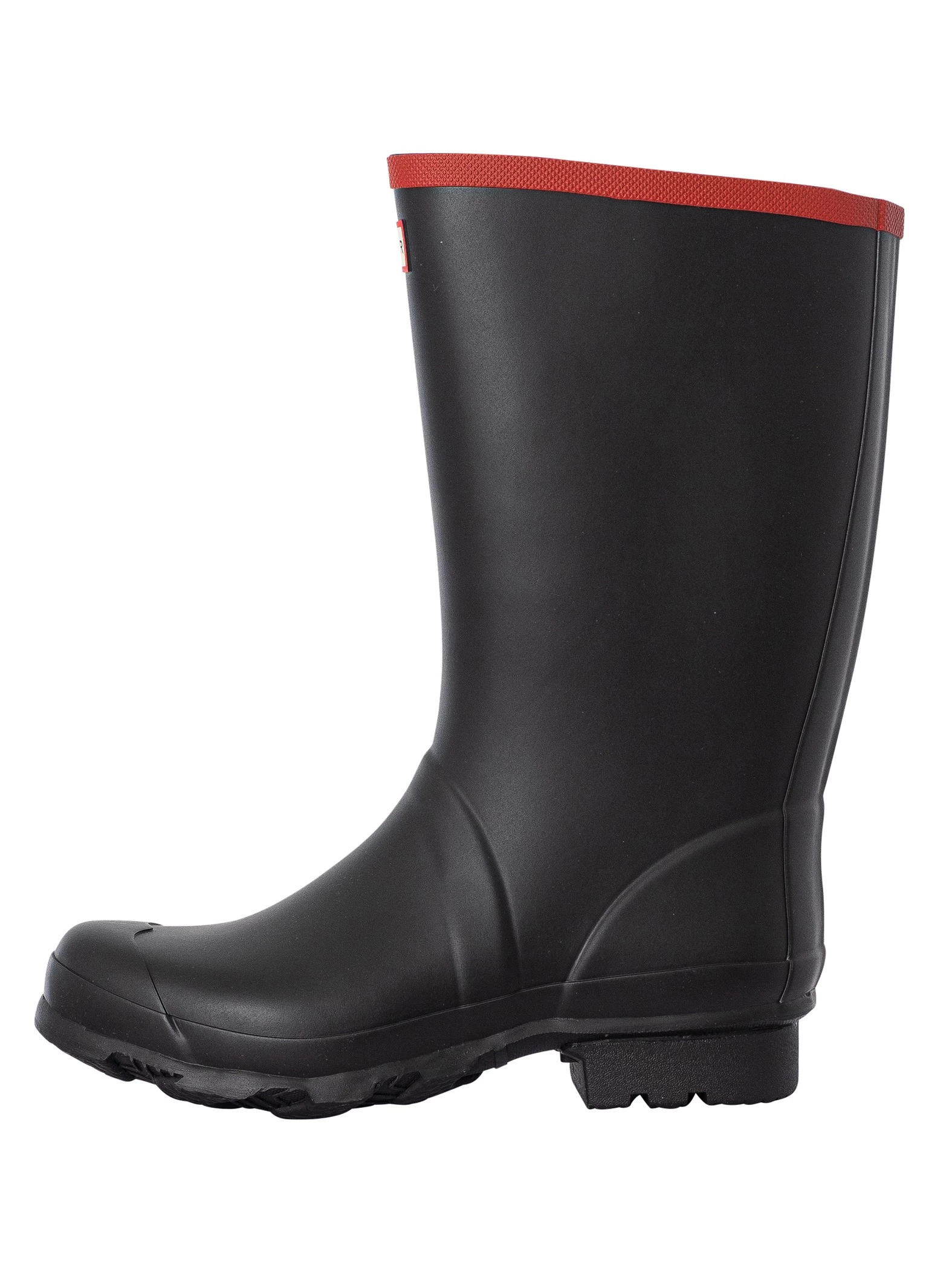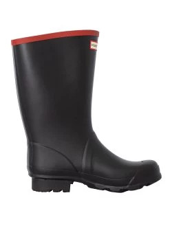 The Hunter Argyll Short Knee Wellington Boots in Black are the perfect companion for outdoor activities. Their heavy-duty rubber construction and wide tread sole offer durability and reliable traction. With branding on the front, these boots exemplify the quality and style characteristic of the Hunter brand.