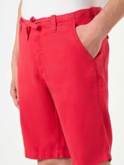 Casual short for your free time, red solid color, comfort fit, buttons closed and drawstring waist, two pockets on sides and back without flap, two extra buttons inside, blue St. Barth graphic, knee lenght. Styled in St. Barth. Composition: 100% Linen. Model Filicudi 41.