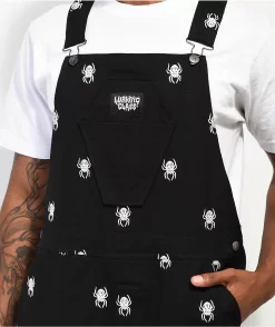 The Spider overalls from Lurking Class by Sketchy Tank is made of 100% cotton and come in a black colorway with white spiders embroidered throughout. These overalls have adjustable shoulder straps and come adorned with a coffin-shaped pocket on the chest, back patch pocket, and slash hand pockets on the hips.