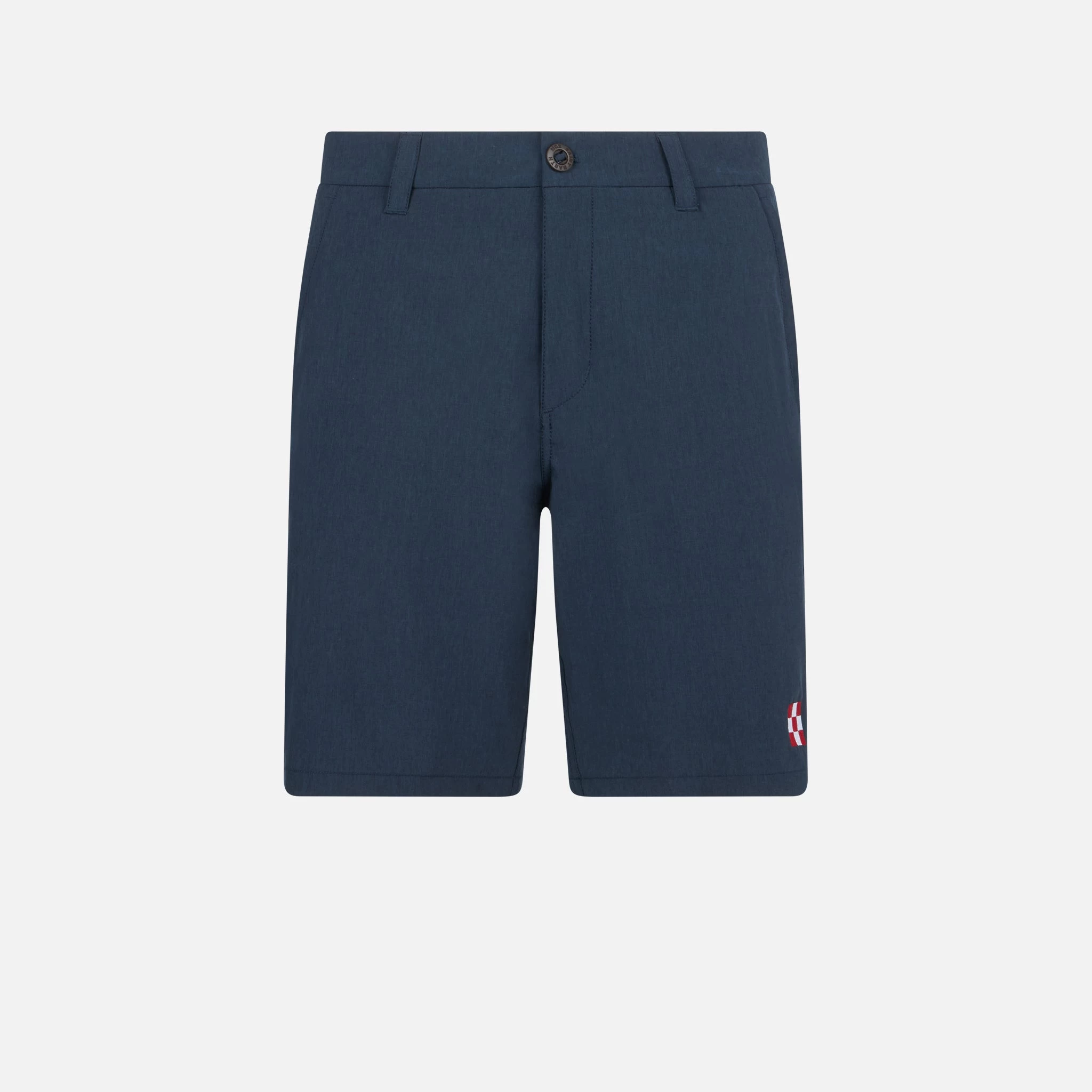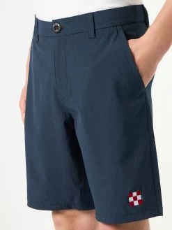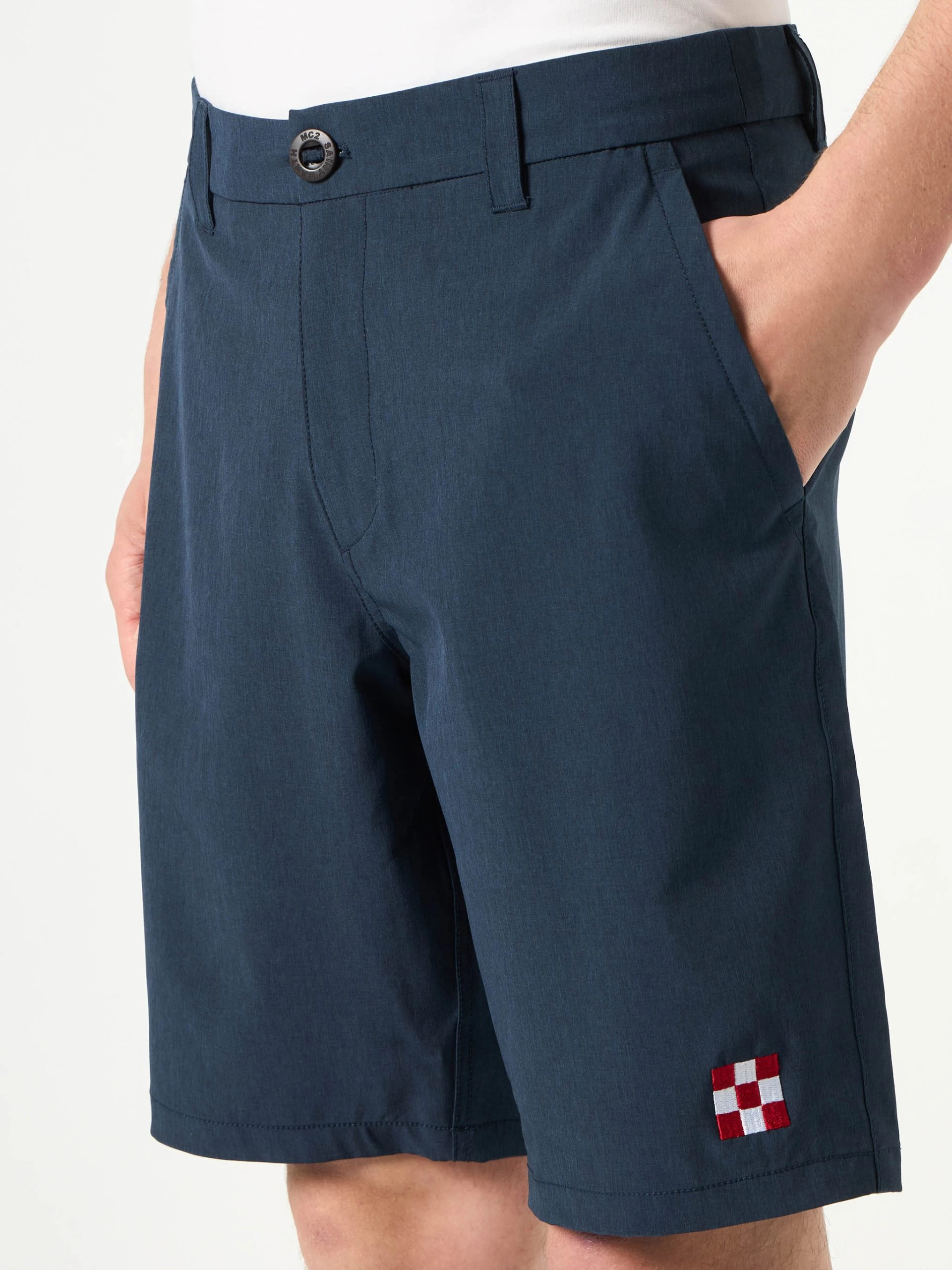 Ripstop Fabric Bermuda for men. Casual short for your free time, blue navy solid color, red and white checked embroidered MC2 Saint Barth new logo, comfort fit, buttons closed and drawstring waist, two pockets on sides and back without flap, two extra buttons inside, knee lenght. Styled in St. Barth. Composition: 100% ripstop fabric.