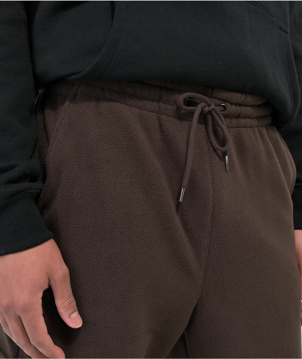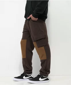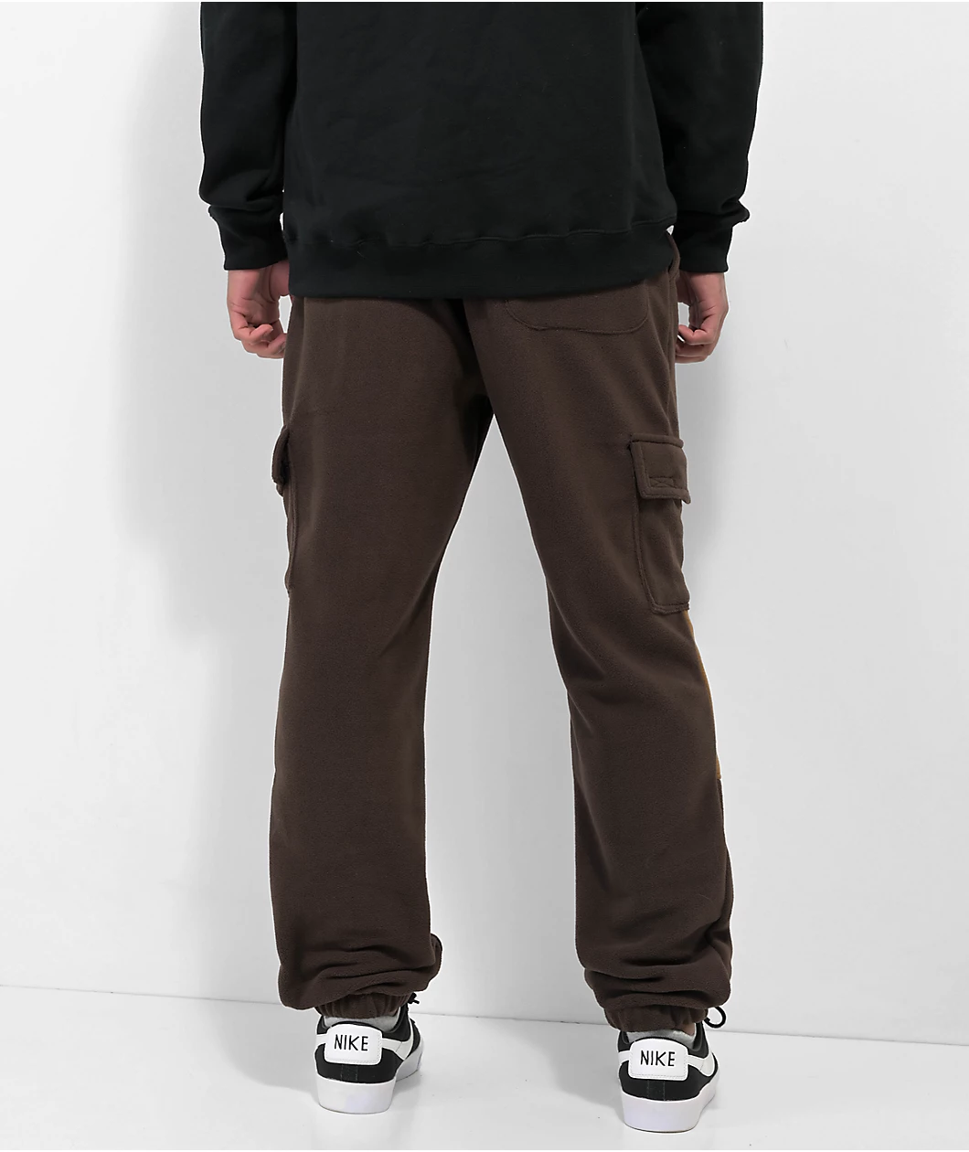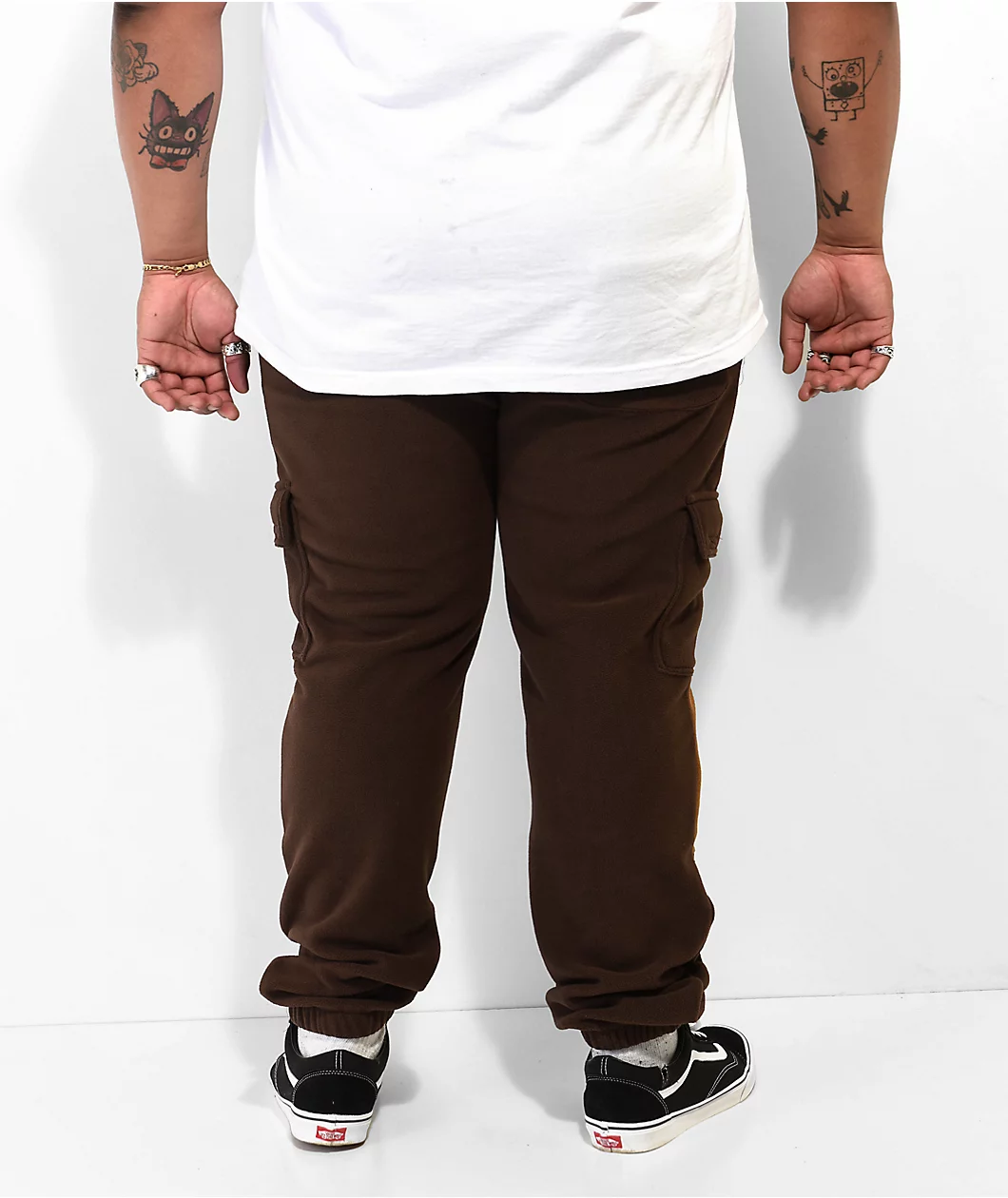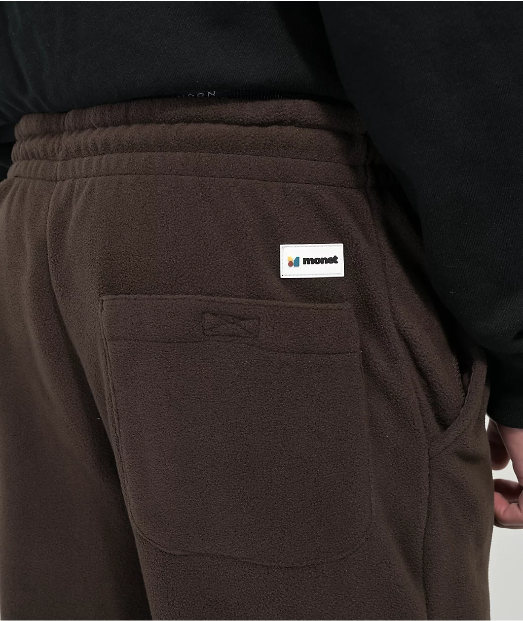 The Cozay cargo pants from Monet are made from a brown micro fleece material, with a cozy relaxed fit. The fleece cargo pants boast cinched bottom hems and an elastic drawstring waistband for a comfortable fit, while light brown color blocked knees and cargo pockets along the thighs add a luxe feel.