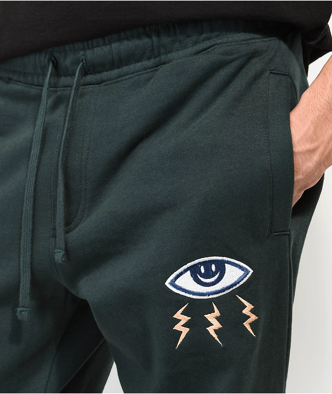 From Primitive comes the Reboot fleece sweatpants in a green colorway, featuring embroidered graphics throughout; along with rubber detailing that adds a high quality feel. Down the left thigh an eyeball with a smiling face for the pupil shoots bolts of lightning in a gold accent, while further down the Primitive brand name can be seen in a similar accent but made from a rubber material that adds some weight. Down the right leg is even more embroidery of Japanese lettering with additional rubber detailing, including cartoon style clouds and a pair of eyes that seem to squint suspiciously at the viewer. These sweats feature two front slash hand pockets, a zippered welt seat pocket on the right side, and come complete with an adjustable drawstring waistband for a snug fit.