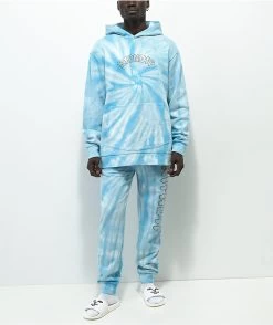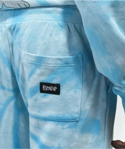 With the brand name in rhinestones down the right leg, The Sent From Heaven tie dye sweatpants from RIPNDIP come in a light blue colorway with a soft, fleece lining inside for maximum comfort and style.