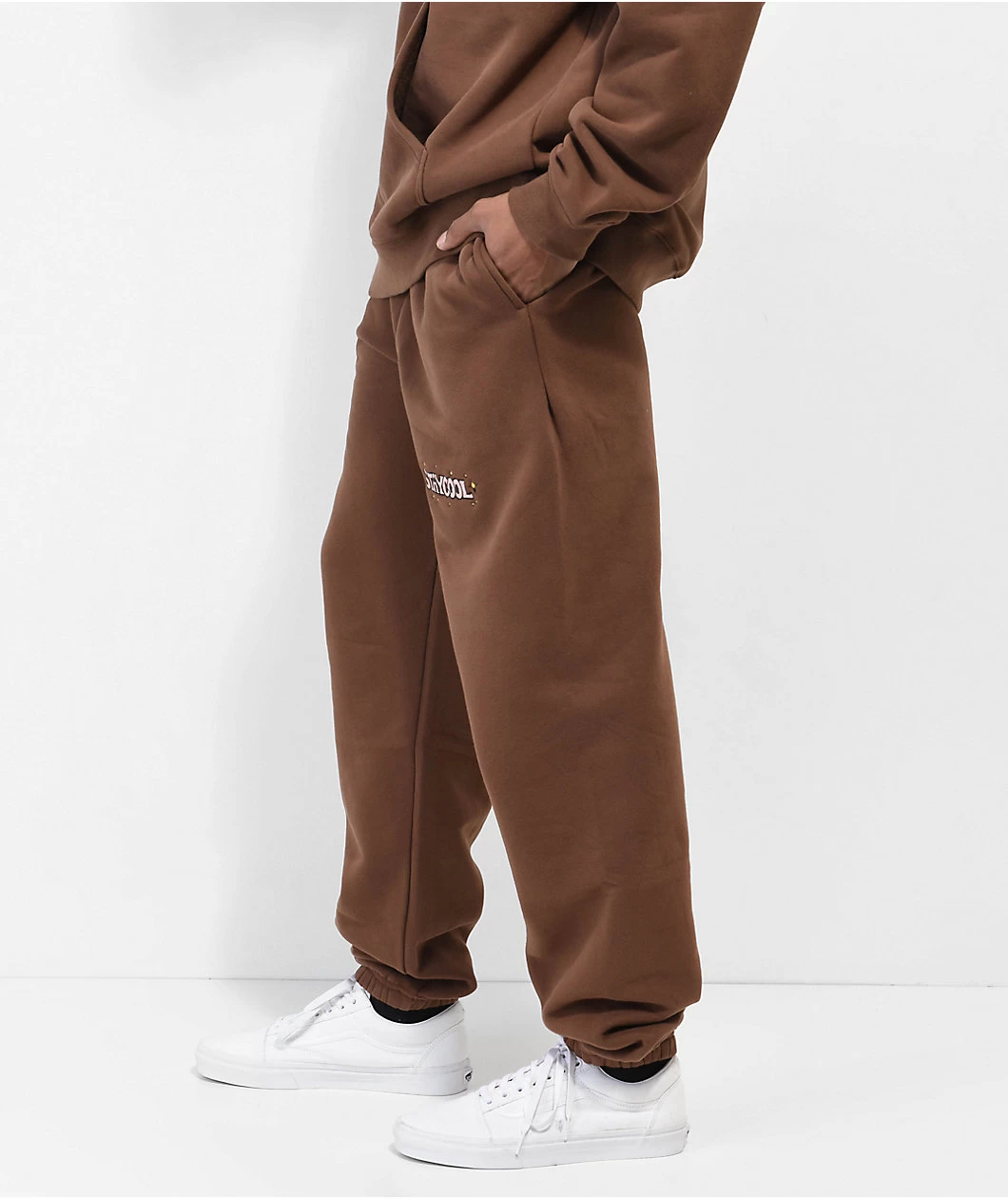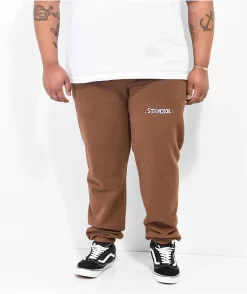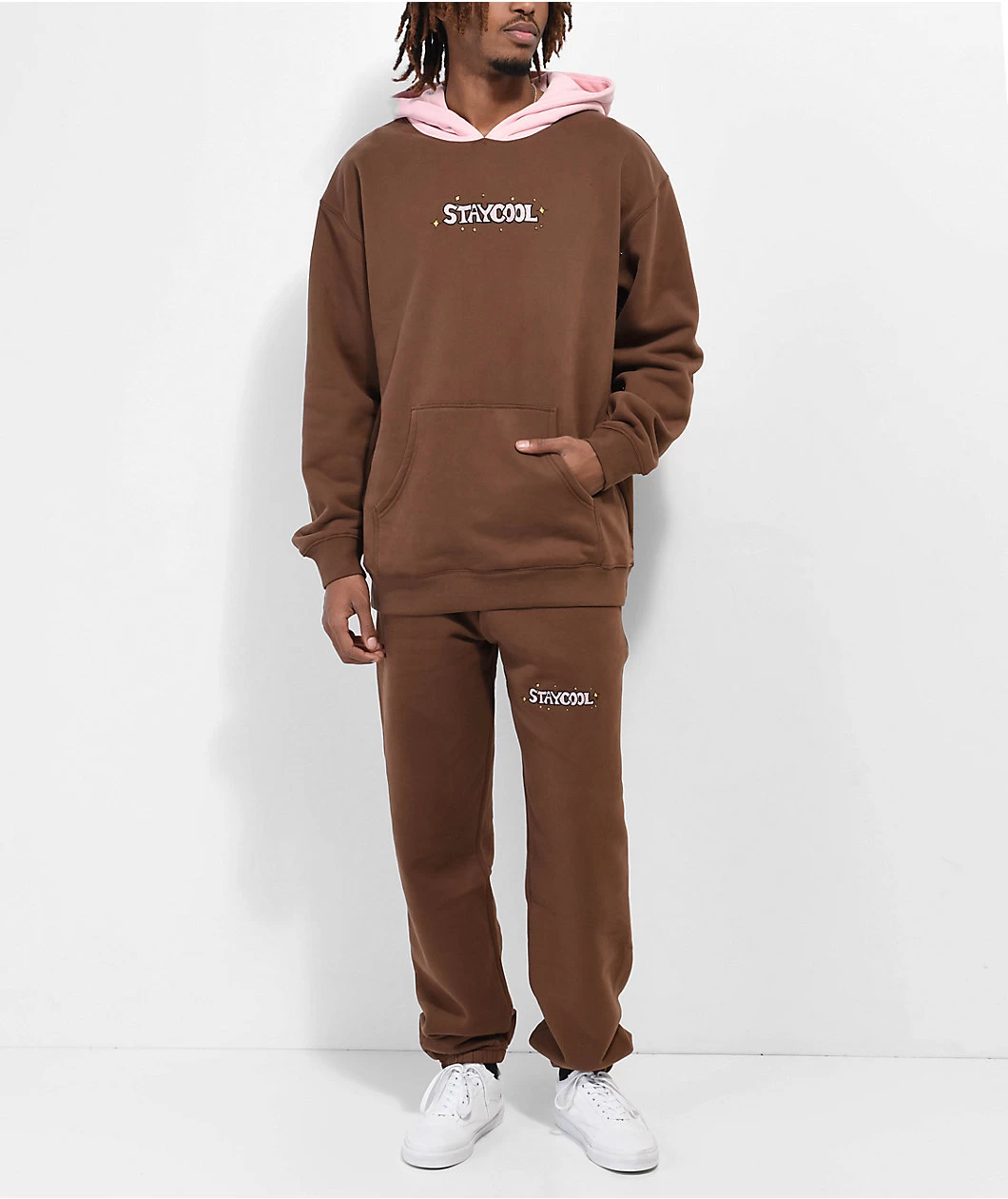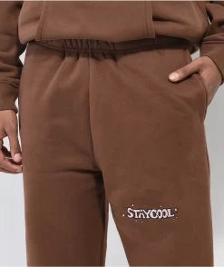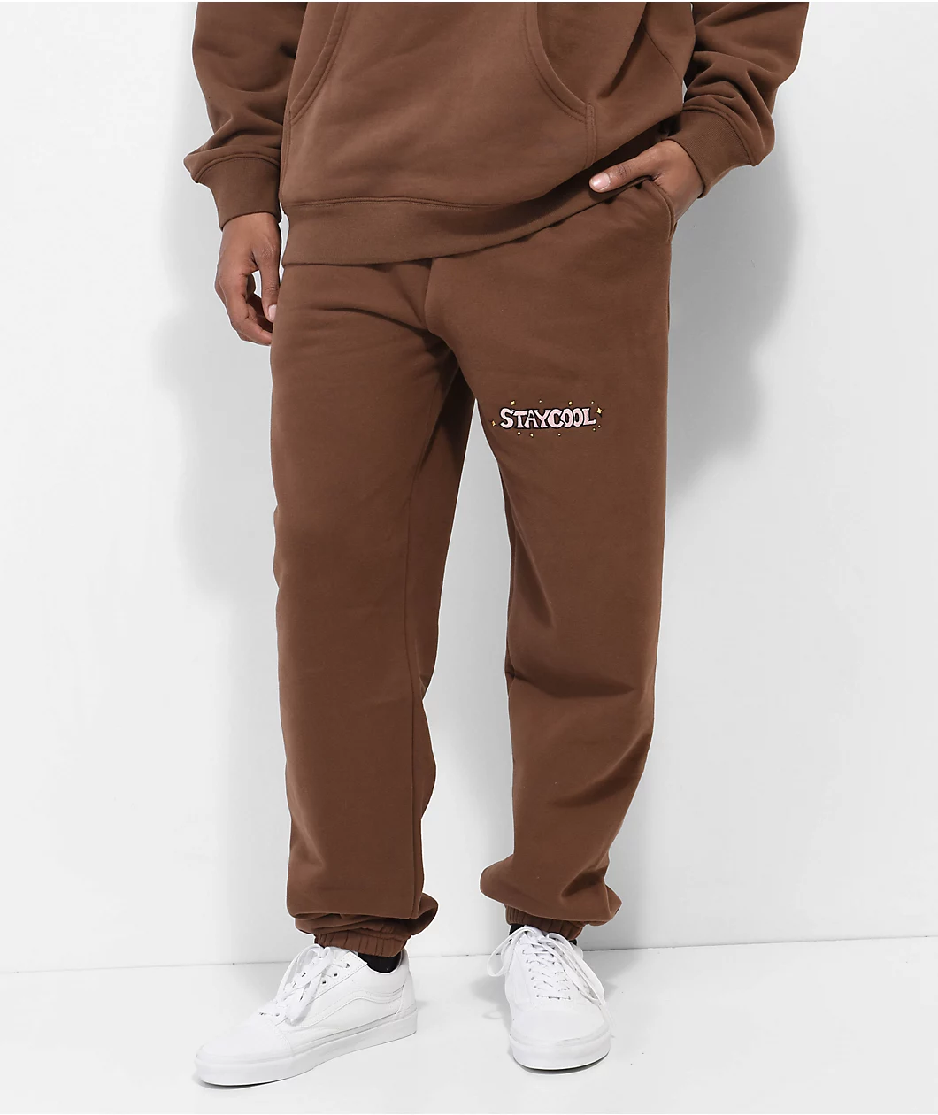 The Sparkle sweatpants from Staycoolnyc come in a brown cotton-poly construction with an elastic waistband and leg openings; the perfect addition for any winter closet. Adorning the left thigh is embroidered script reading, “Stay cool” in pink, amongst gold sparkle icons for a dazzling look.